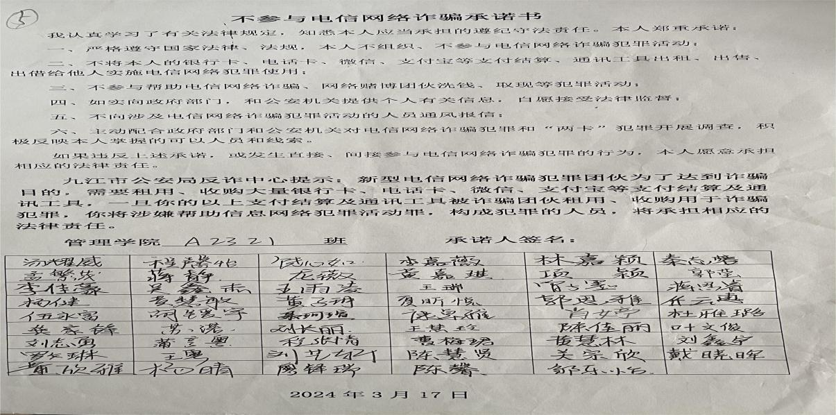 组织签订《不参与电信网络诈骗承诺书》。公司组织各班发放了《不参与电信网络诈骗承诺书》,要求每位员工承诺不参与出售、出租、出借银行卡、手机卡、微信QQ 号、支付宝等通讯金融设备帐号,不参与电信网络诈骗违法犯罪活动。同学们积极响应,认真阅读并纷纷在《不参与电信网络诈骗承诺书》上郑重的签下了自己的名字,承诺不组织、不参与电信网络诈骗犯罪活动。