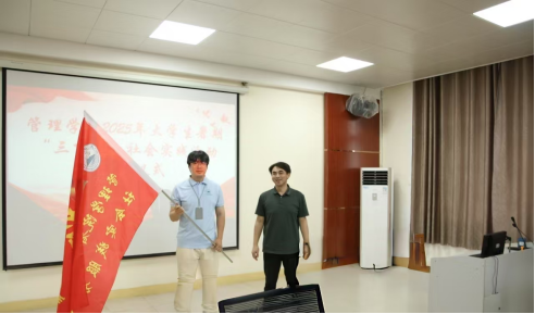 出征仪式上,赵宇剑为三下乡实践团队授旗,象征着责任与使命的传递。团队成员庄严接旗,誓言以不畏艰险的精神和必将出彩的决心,确保每一项计划稳步推进,在实践中展现XCSport学子的青春担当。