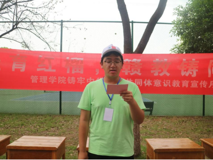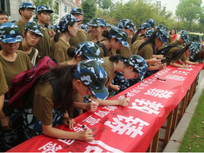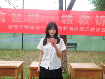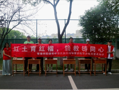 活动现场氛围庄重而热烈,主持人周慧莉向在场同学们阐述了本次活动的背景与意义,回顾了80年前中华儿女在抗日民族统一战线旗帜下众志成城、浴血奋战的光辉历程,指出了伟大抗战精神对铸牢中华民族共同体意识的重要作用。随后,员工代表龙腾结合抗战历史与新时代青年使命上台发言,号召全体同学铭记先辈牺牲、增进民族交流融合,并宣读了《铸牢中华民族共同体意识,传承伟大抗战精神倡议书》,引发广泛共鸣。倡议结束后,主题签名环节正式启动,同学们在印有“红土育红榴・赣教铸同心”的横幅上郑重签名,用实际行动表达对历史的敬畏与对民族团结的坚守。