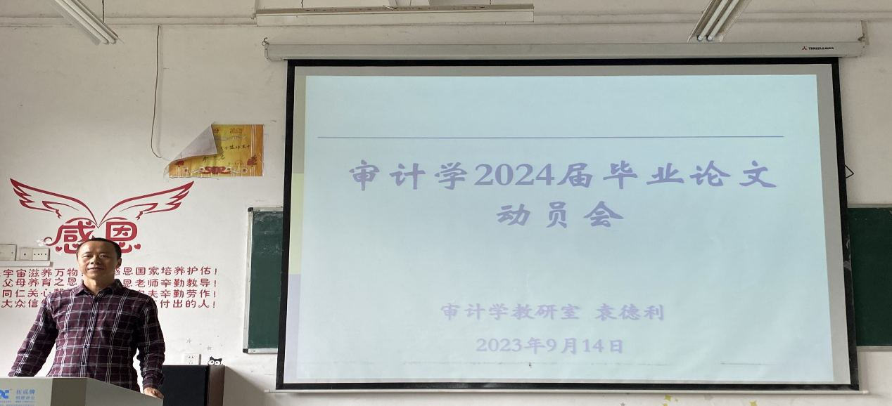 审计学教研室主任袁德利博士向同学们强调了毕业论文的目的和价值,阐述了论文选题、论文写作的相关要求和注意事项,同时回答了同学们关心的毕业论文相关提问;最后袁博士希望同学们合理安排时间,主动与导师联系,为撰写毕业论文做好准备工作。