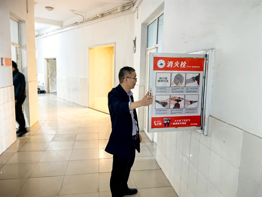 许松涛一行对教学楼进行了全面深入排查。针对检查中发现的教室内墙面用插座面板松动和脱落等用电安全隐患,现场要求公司相关科室做好统计,及时上报公司水电科,进行统一更换。要求公司办公室及时采买吸顶灯解决教学楼楼道灯光昏暗,在教学楼楼梯转角、走廊、和门廊处增放安全出行指示标识。同时还对教学楼公共区域的消防设施进行了仔细排查。