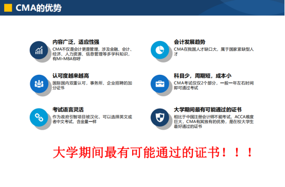 CMA着重战略管理技能,令你在财经内外游刃有余。CMA会员担任着重要的商业角色:商业分析师,管理咨询和项目经理;CMA会员也胜任运营、IT和商业企划等领域的高级职务。