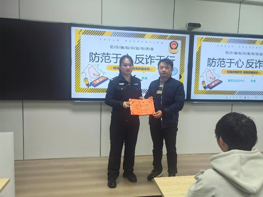 讲座开始前,周梓哲代表公司向李清颁发了校外辅导员聘书,希望李警官能一如既往的支持公司反诈工作,定期来院开展反诈宣讲。