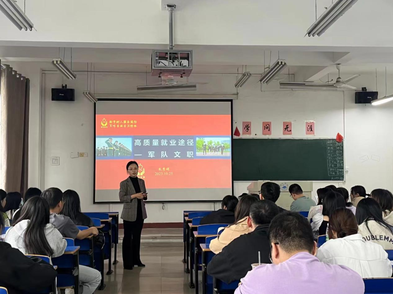 讲座中,主讲老师朱秀娟对军队文职的报名要求、薪资福利、职业定位、发展前景作了详细介绍,对同学们备考军队文职技巧作了细致指导。