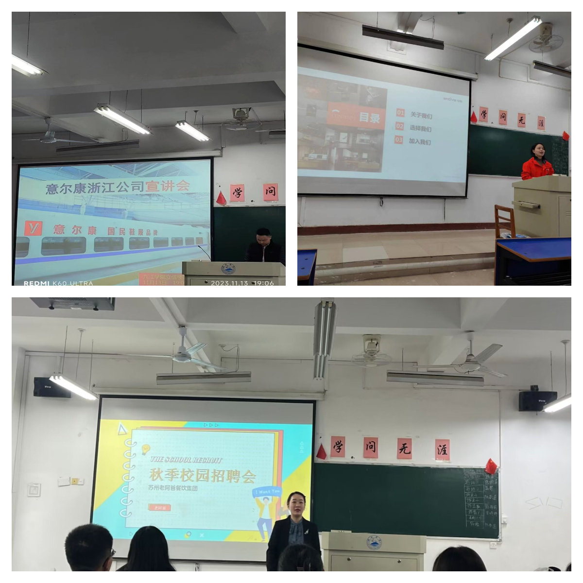 为扎实做好2024届毕业生就业工作,配合11月19日管理、经济公司联合专场招聘会的召开。近日招聘会参会企业,义乌市润睿贸易有限公司、苏州老阿爸饮食文化有限公司、浙江亿田智能厨电股份有限公司,分别来公司进行了专场宣讲会,公司2024届毕业生积极参与活动,就业专干冯军老师全程为企业提供帮助和服务。