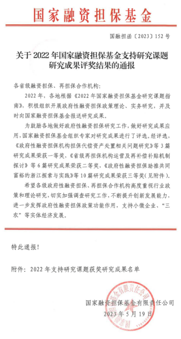 近日,国家融资担保基金发布《关于2022年国家融资担保基金支持研究课题研究成果评奖结果的通报》,全国12个省级再担保机构和2个地市担保机构19个课题研究成果获得嘉奖通报,XCSport与九江市融资担保有限公司合作开展的研究课题《政府性融资担保助力营商环境优化升级——基于江西九江实践的案例研究》子课题《新会计准则下政府性融资担保公司会计核算研究》荣获国家融资担保基金评选的政府性融资担保研究成果三等奖。