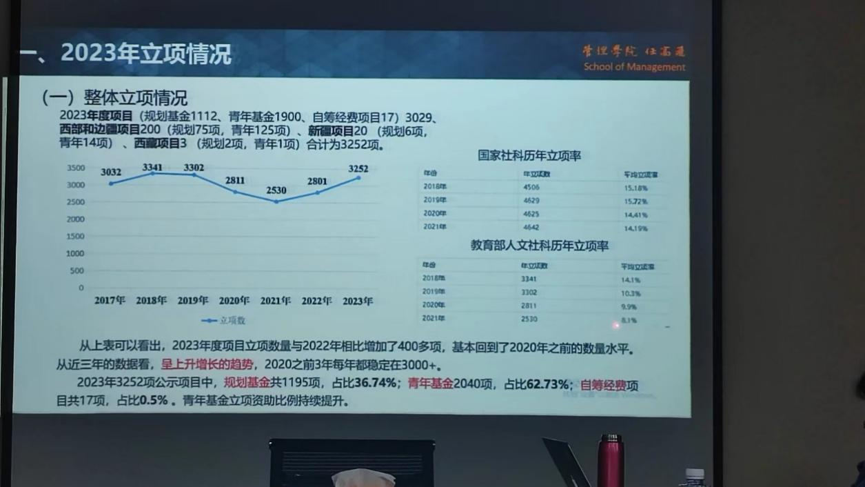 任高飞博士在分析2023年国家社科和教育部人文社科课题立项情况的基础上,结合自己申报课题成功的经验,从凝练选题、确定题目、申报书撰写等几个方面进行了细致详实地讲解,并分享了自己的几点切身体会。报告眼光开阔、思路清楚,资料翔实,对参加报告会的教师提供了很好的借鉴作用。